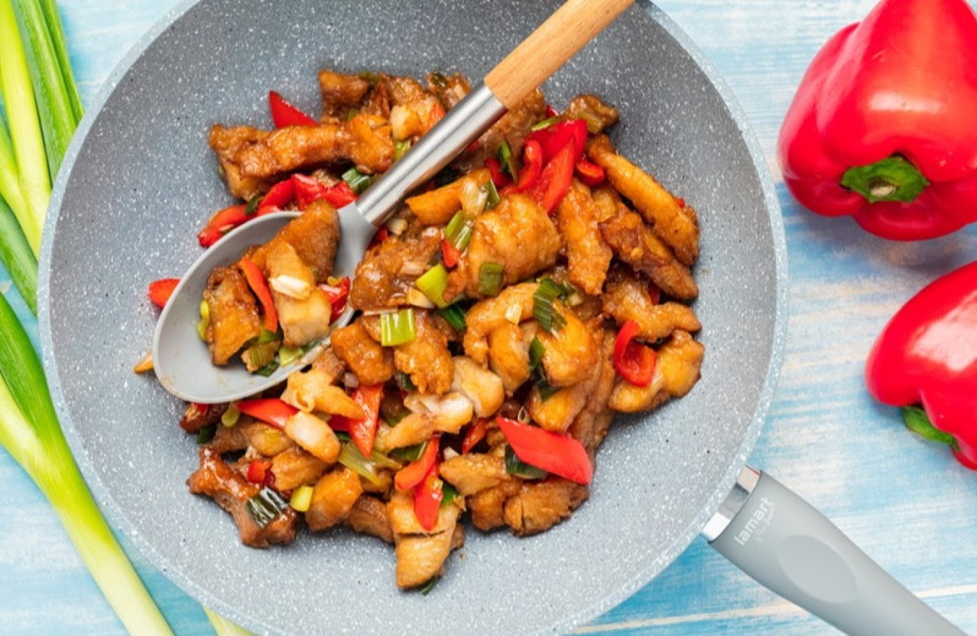Po usmažení slijte větší část oleje a do pánve vložte očištěnou a na kousky nakrájenou kapii, jarní cibulku na kolečka a společně orestujte.