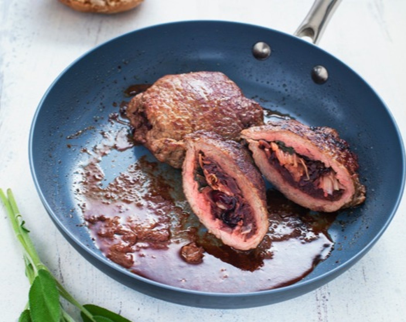Maso osolte, opepřete. Do středu masa položte šalvěj, brusinkový kompot a na velmi tenké nudličky nakrájenou bílou část pórku.