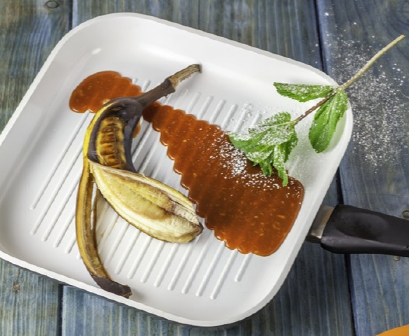 Slupku banánu po upečení do půlky roztrhněte a i se slupkou servírujte. Ozdobte čerstvou mátou.