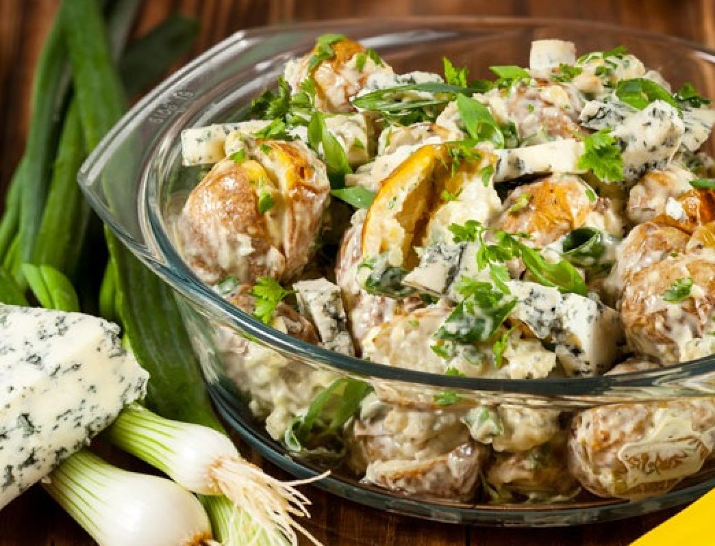 Do misky dejte majonézu a přidejte nahrubo nastrouhaný sýr s modrou plísní, nahrubo nakrájenou zelenou část jarní cibulky a utřený česnek. Vše dobře zamíchejte a přidejte k bramborám.