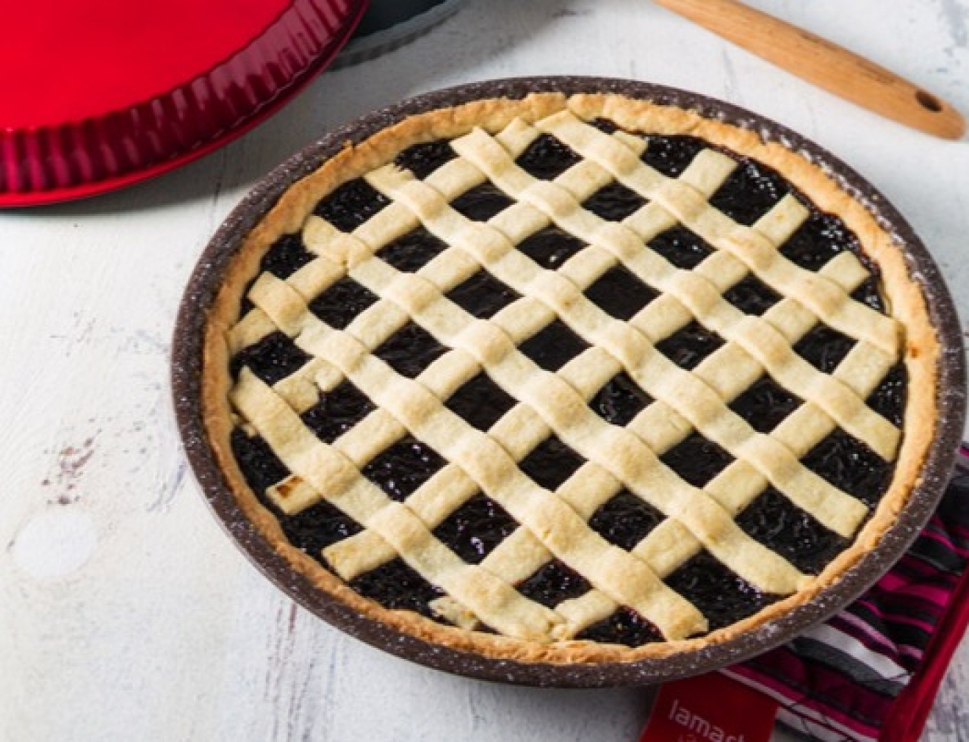 Ze zbylého těsta vyválejte tenký váleček a vytvořte z něho na povrchu koláče mřížku.
