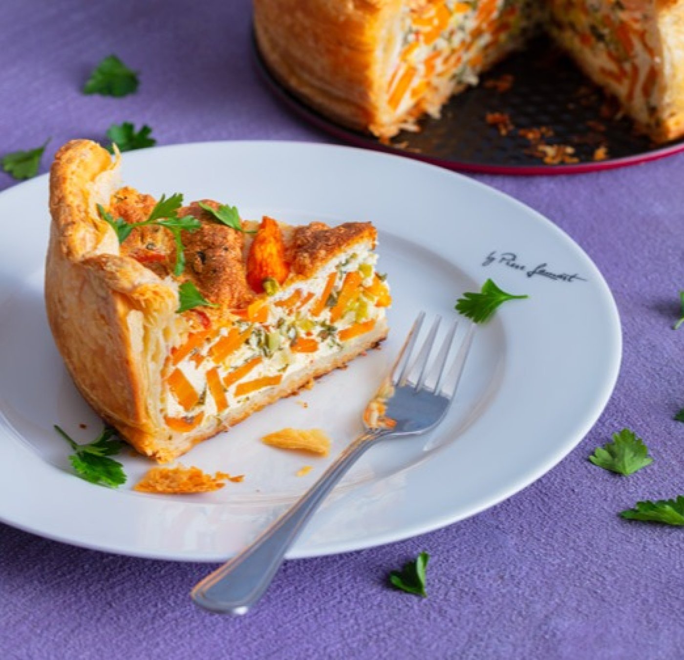 Na listové těsto dejte připravenou směs mrkve a zalijte smetanou s vejci. Povrch uhlaďte. Koláč pečte 50 minut na 200 °C a dalších 20–30 minut na 175 °C dozlatova.