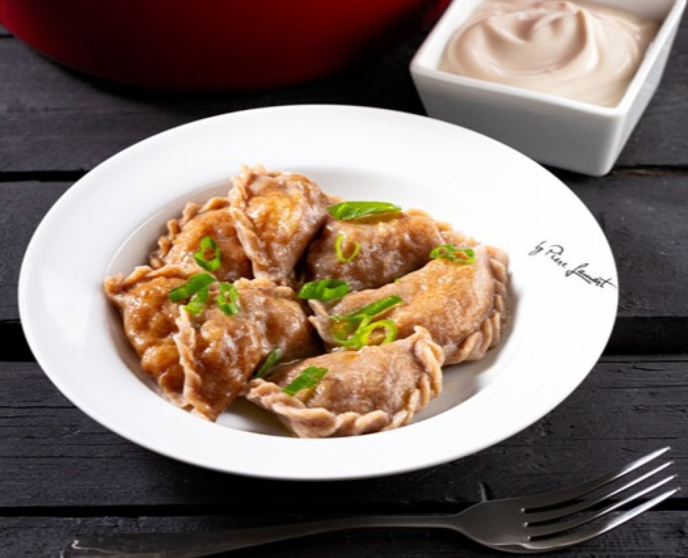 Po uvaření můžete varenyky s bramborovou náplní ihned podávat. Povrch bohatě ozdobte zakysanou smetanou a můžete posypat čerstvou jarní cibulkou.