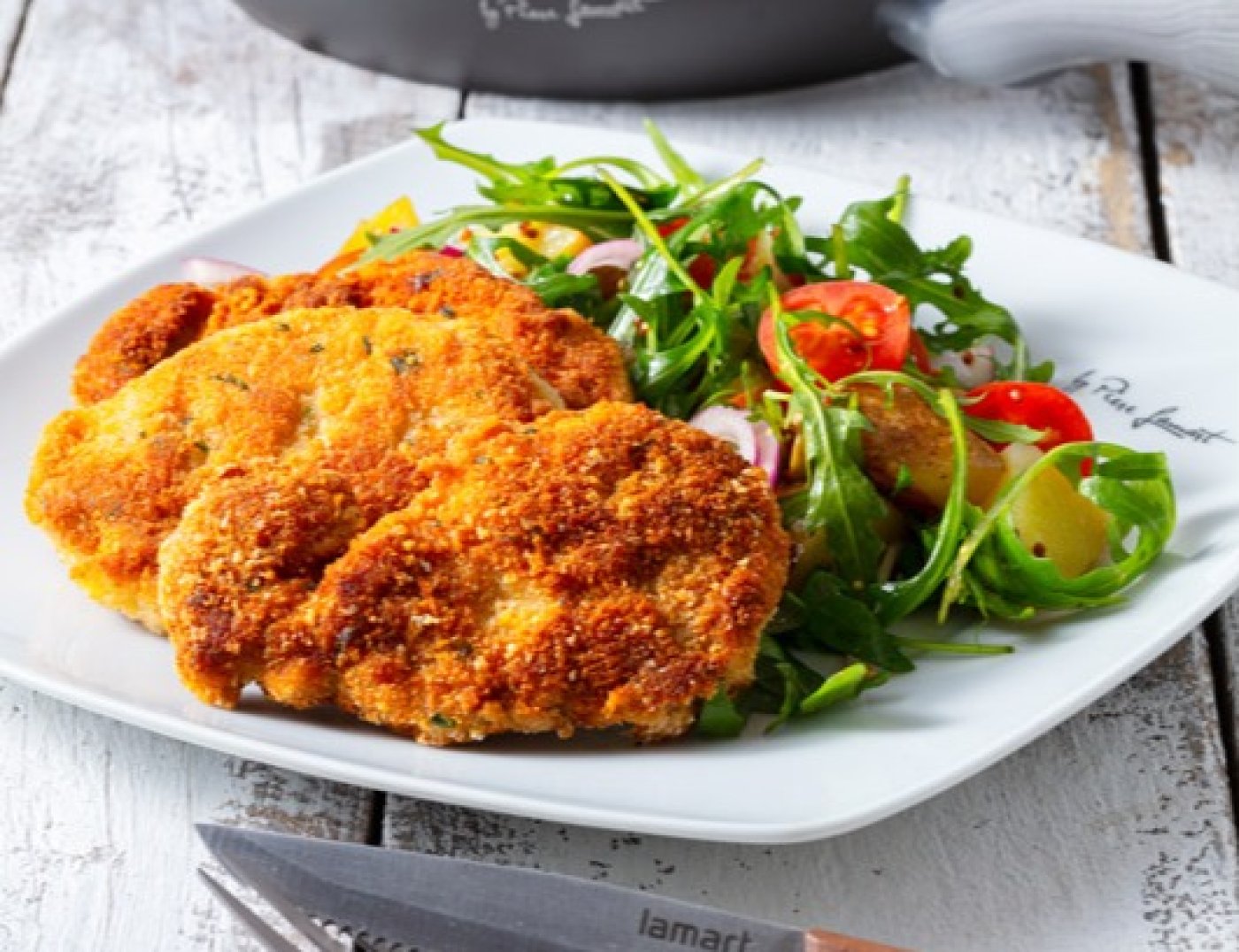 Řízečky z panenky v parmazánové strouhance podávané se zeleninovým salátem potěší každého gurmána. Salát z rukoly skvěle doplní a odlehčí chuť masa a výslednou kombinaci si nejlépe vychutnáte k obědu nebo večeři.
