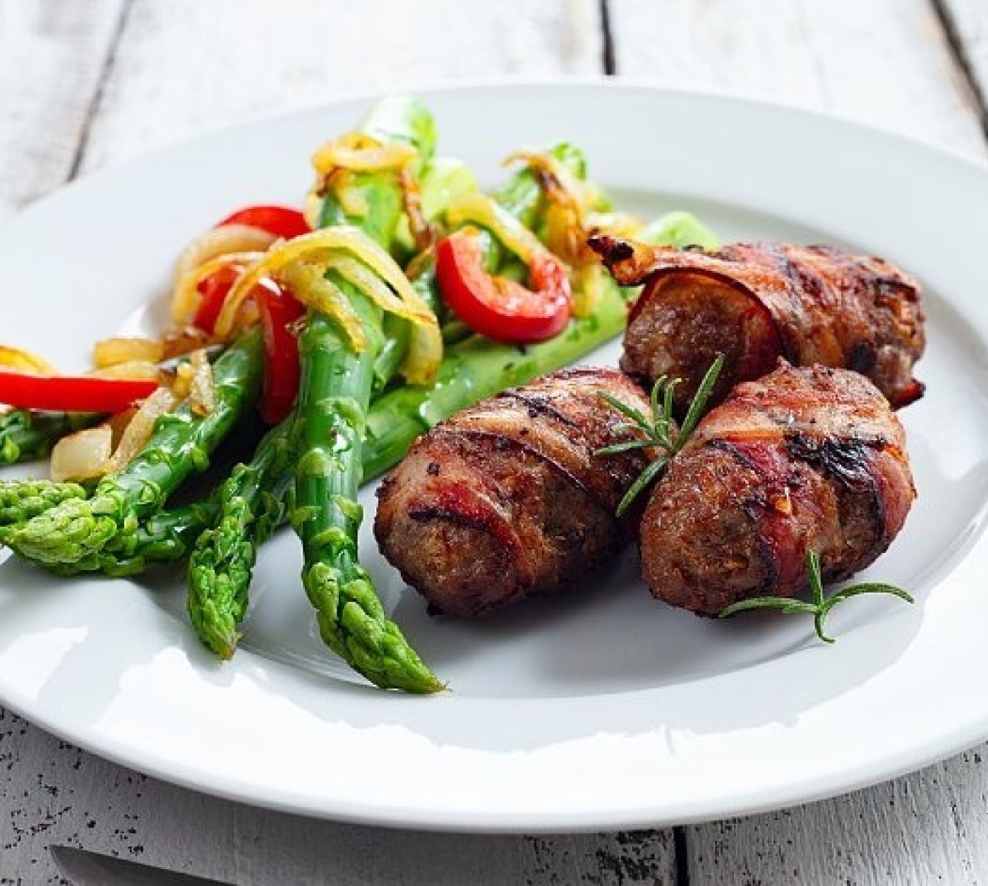 Vytvořte podlouhlé karbanátky a převažte je proužky slaniny.