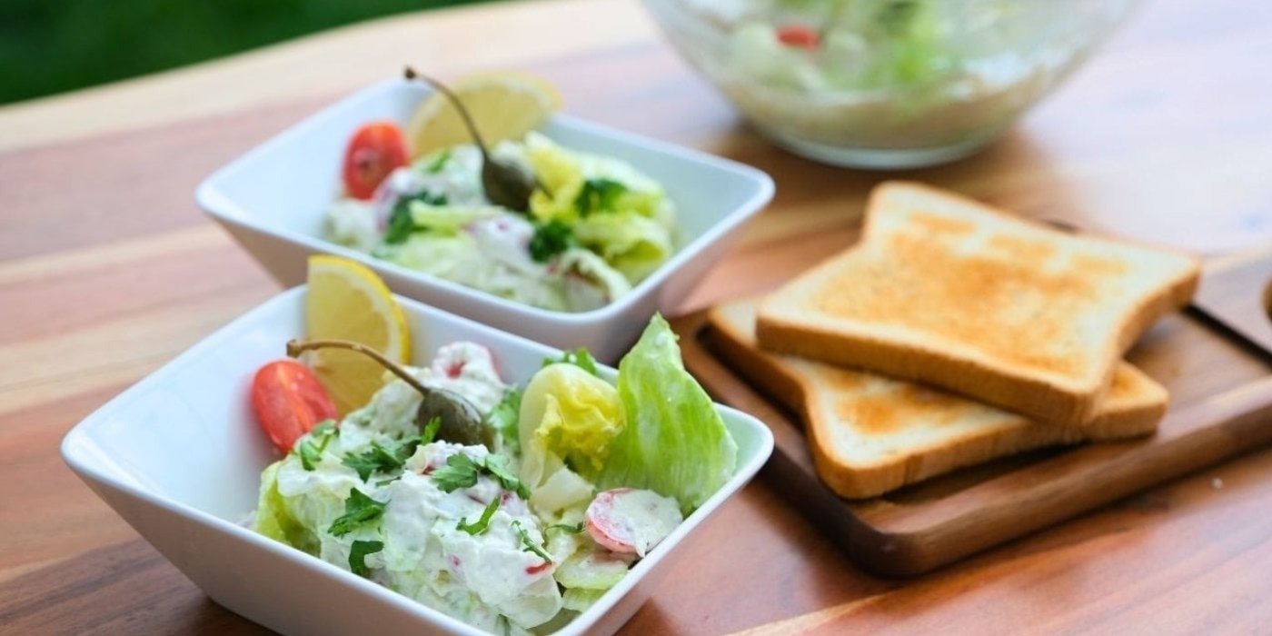Salát podávejte vychlazený s kouskem opečené bagetky nebo toustu.