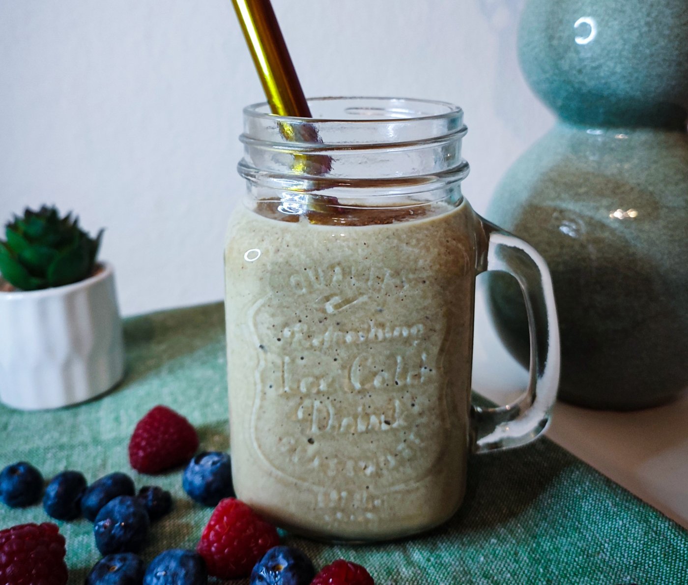 Smoothie nalijeme do sklenice s brčkem a můžeme podávat.