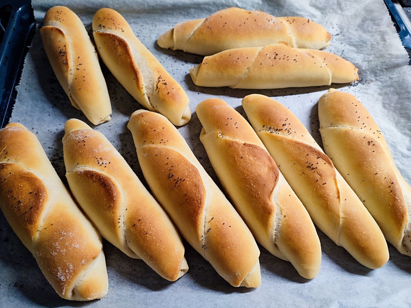 Poté je potřeme vodou (nebo vodou se solí) a posypeme mákem, sezamem či lněným semínkem. Vložíme do trouby a pečeme na 230 °C zhruba 15 minut. Průběžně je kontrolujeme – pokud mají různou velikost, ty menší budou hotové dřív. Upečené rohlíky poznáme podle zlatavé barvy navrchu i zespodu.