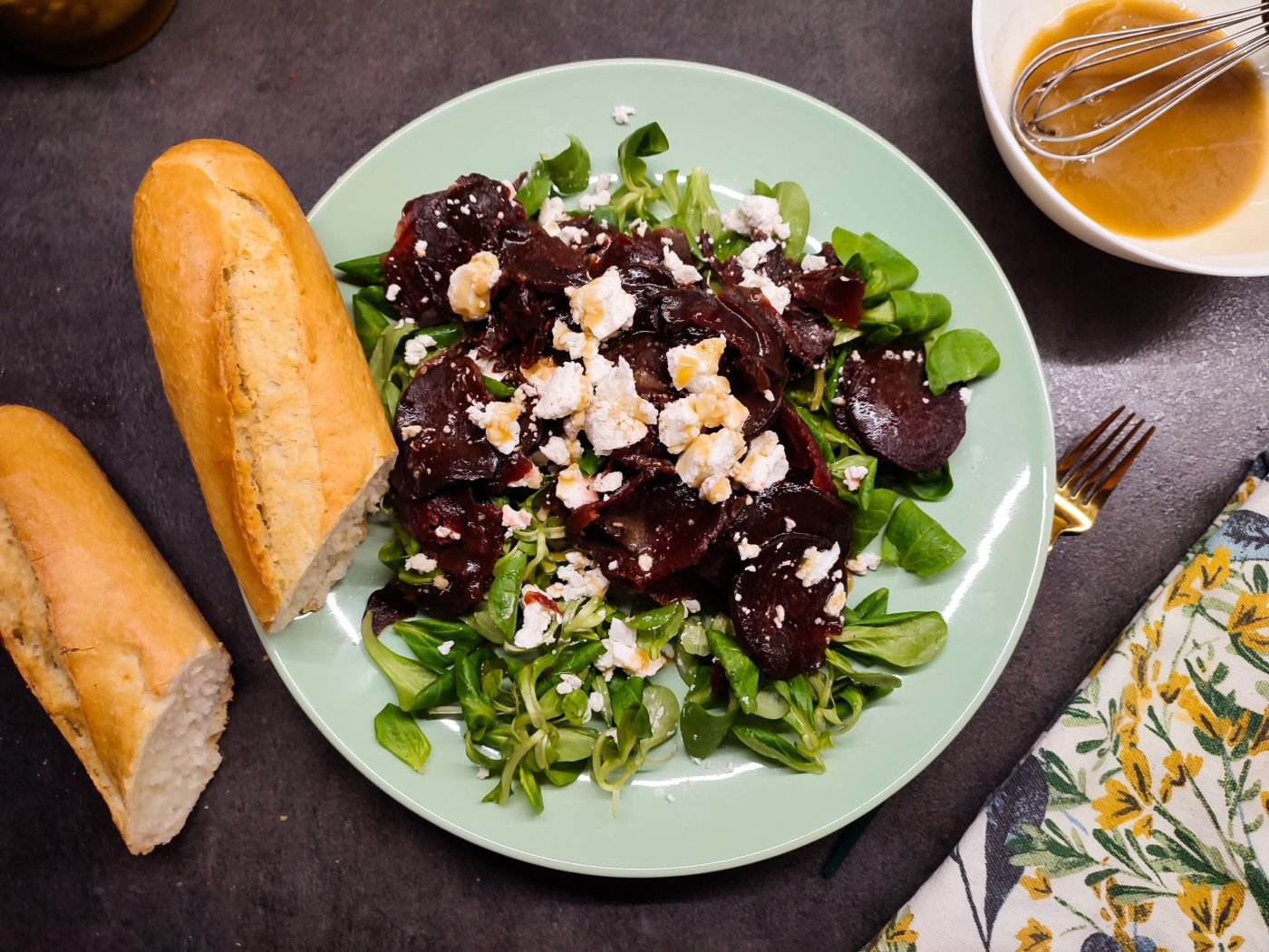 Salát z červené řepy s kozím sýrem, polníčkem a ořechy skvěle poslouží jako výtečná večeře. Příjemně vás zasytí a doplní řadu tělu prospěšných látek. Podávejte ideálně s kouskem bagetky nebo opečeným toustem.