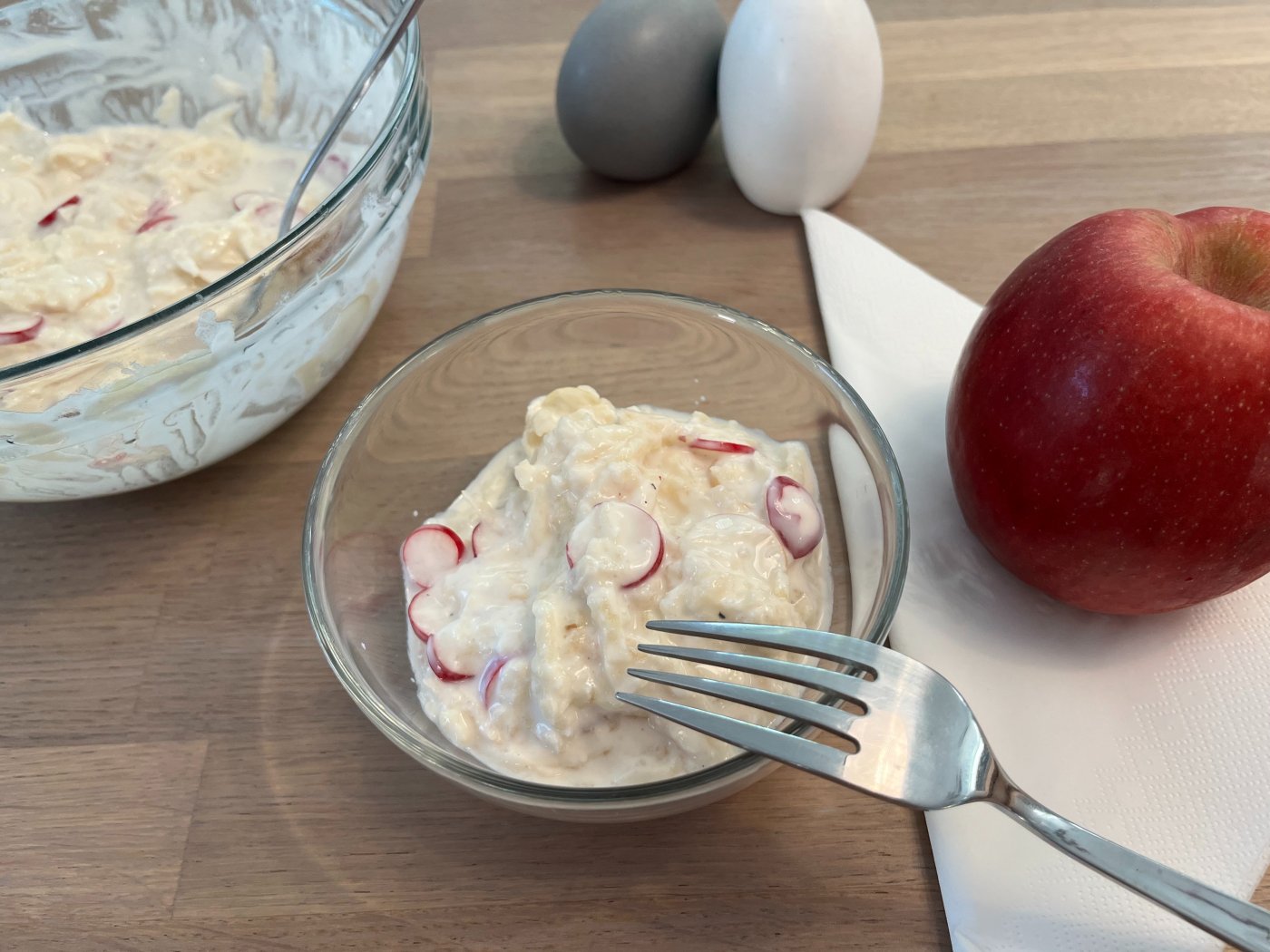 Nastrouhané jablko a nakrájené ředkvičky smícháme s bílým jogurtem. Dochutíme solí a pepřem.