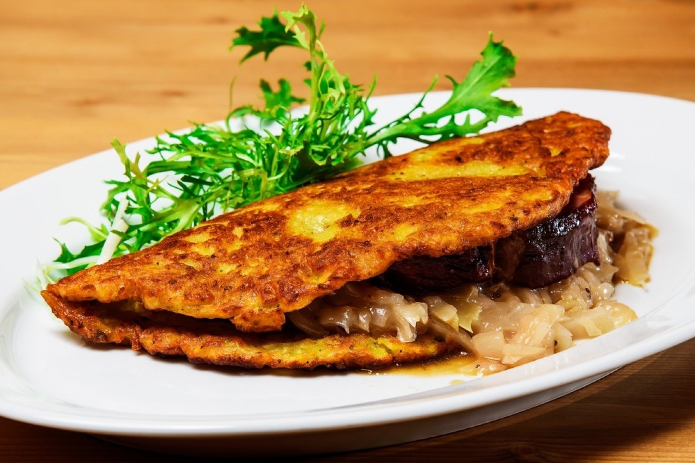 Bramboráky podáváme přeložené napůl, naplněné směsí zelí a uzeného masa.