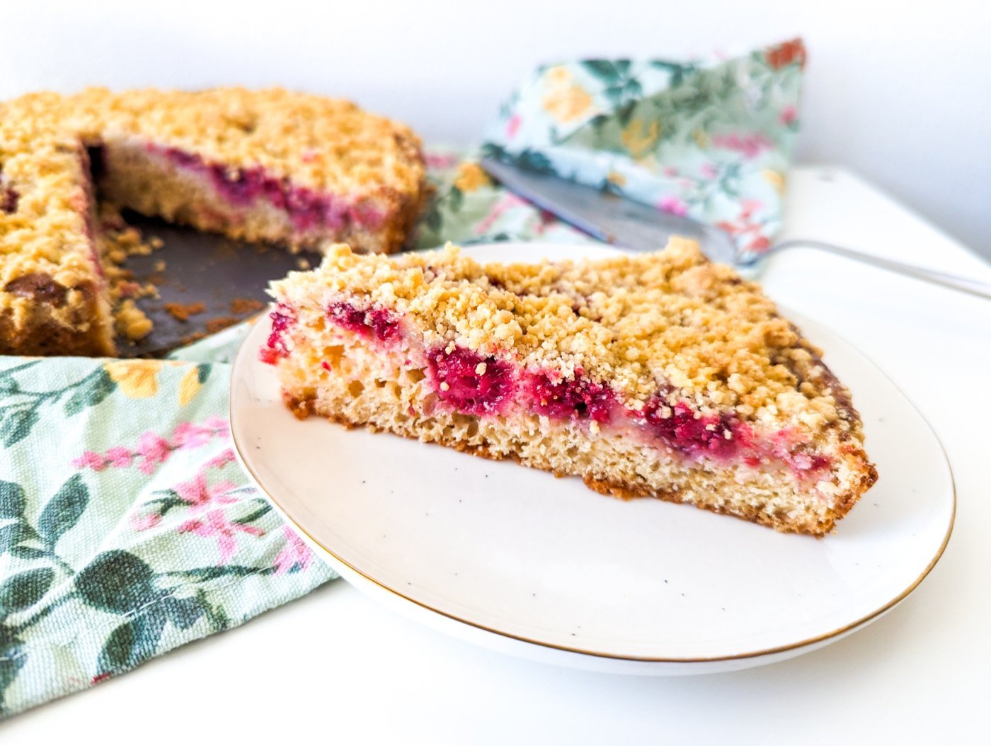 Tento vynikající letní koláč s vůní malin a křupavou drobenkou na povrchu vás ohromí. Zakysaná smetana a banán dodávají koláči na jemnosti a vláčnosti a tvoří dokonalý kontrast se sladkostí ovoce. Příprava je velmi jednoduchá, místo malin můžete využít jakékoliv sezónní ovoce a ještě si pochutná celá rodina.