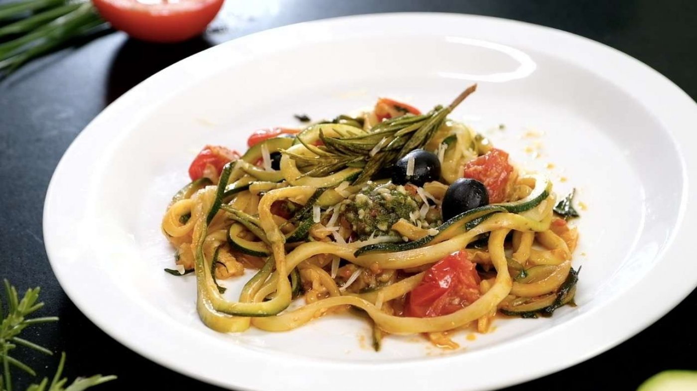 Cuketové špagety s rajčaty a olivami jsou ideální letní jídlo. Jejich příprava je totiž velmi rychlá a jednoduchá. Zkuste si je připravit podle našeho videoreceptu nebo si je ochuťte dle svých preferencí.