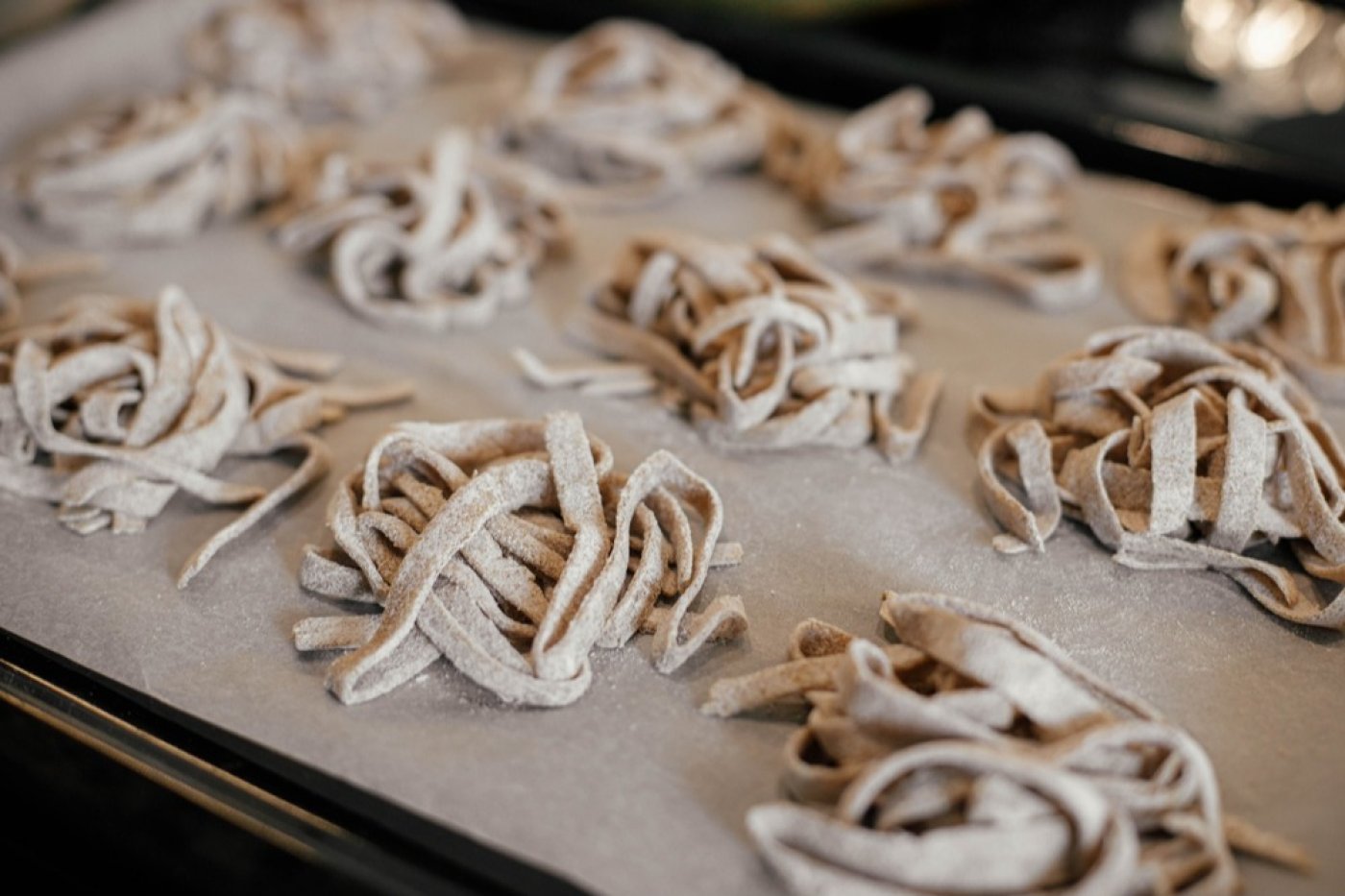 Hotové těstoviny můžeme smotat do hnízd a nechat uschnout na pečicím papíru pro pozdější použití, případně je rovnou uvařit.
