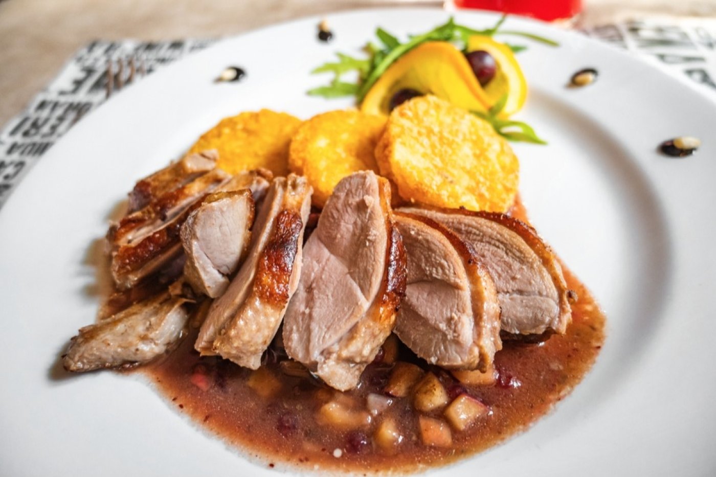 Kachní prsa nakrájejte a podávejte s jablečno-vínovou omáčkou a přílohou.