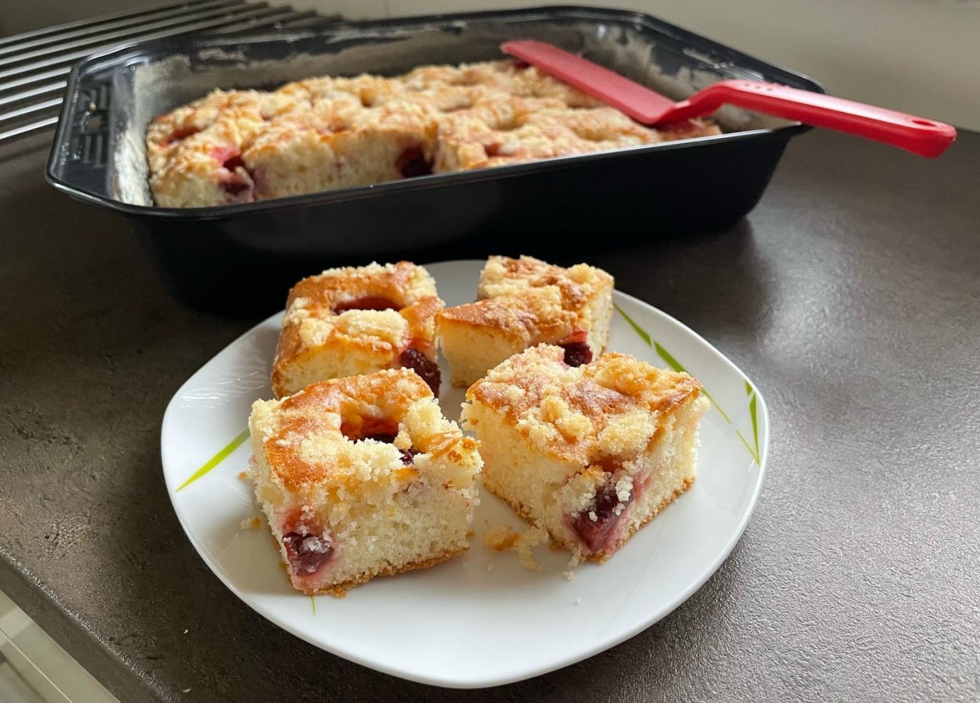 Těsto nalijte do připraveného plechu a rovnoměrně na něj naskládejte višně.