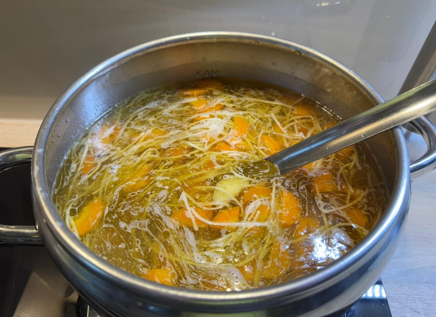 Ztlumte oheň a bez poklice necháme 4–5 hodin vařit – pěnu sbírejte. Vývar můžete vrátit do trouby a péct asi při 120 °C, klidně i přes noc.