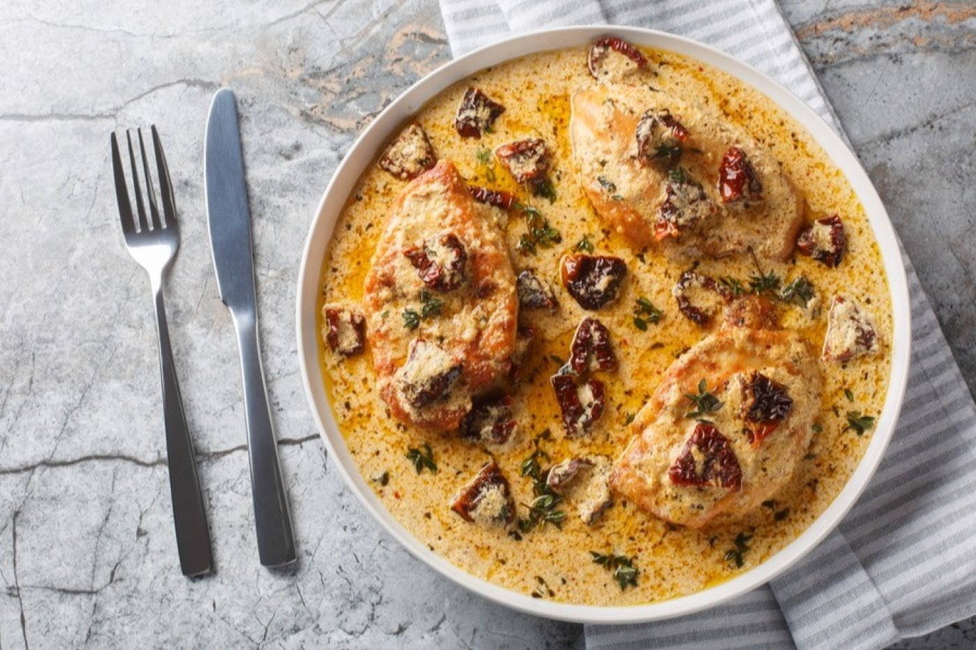 Hotové Marry Me Chicken přendejte na talíře, přelijte omáčkou a ozdobte lístky čerstvé bazalky.