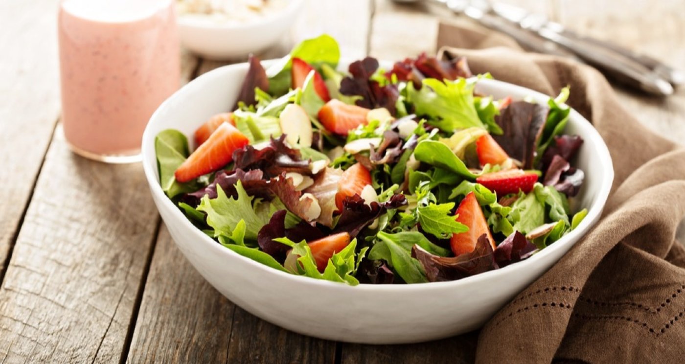 V míse smícháme salát s kousky jahod a sýrem, zalijeme zálivkou a podáváme posypané křupavými mandlovými lupínky.