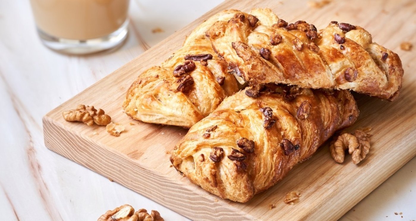 Těsto rozválejte na pomoučeném povrchu na rozměr cca 30×60 cm a nařežte na 15×12 cm obdélníky. Do středu rozetřete náplň a po delších stranách udělejte šikmé zářezy. Proužky překládejte přes náplň a konce dobře utěsněte.