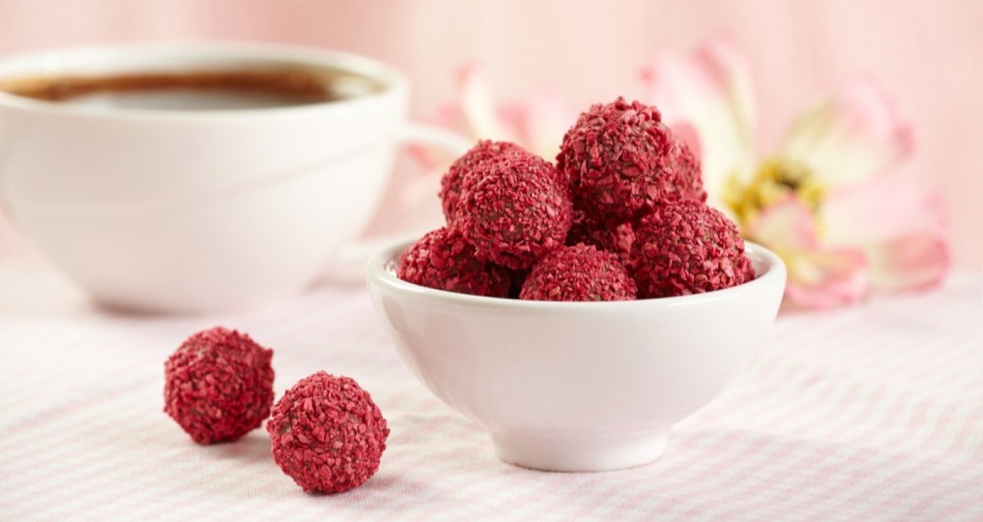 Ztuhlé kuličky postupně namáčejte do čokolády tak, aby byly celé obalené. Ihned je obalte v rozdrcených malinách a vraťte na pečicí papír.