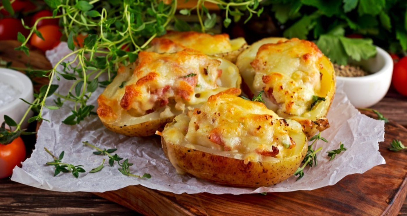 Nejprve si omyjte brambory a uvařte je ve slupce doměkka (přibližně 20 minut). Po uvaření nechte brambory vychladnout a následně je podélně rozkrojte a vnitřek vydlabejte.