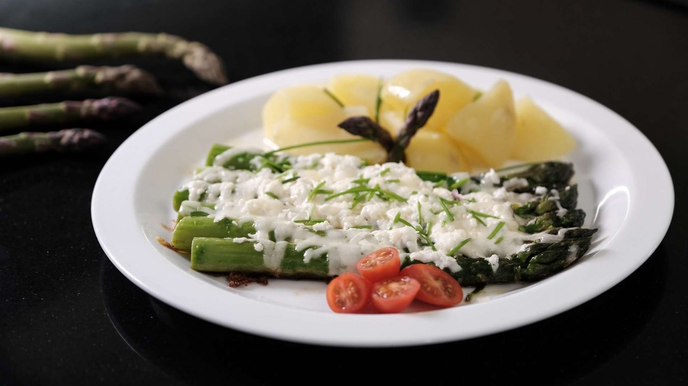 Na pánvi rozpusťte máslo a chřest ze všech stran osmahněte dozlatova, poté jej zasypejte strouhaným eidamem a balkánským sýrem a nechte sýr roztopit, na závěr posypte čerstvě nasekanými bylinkami.